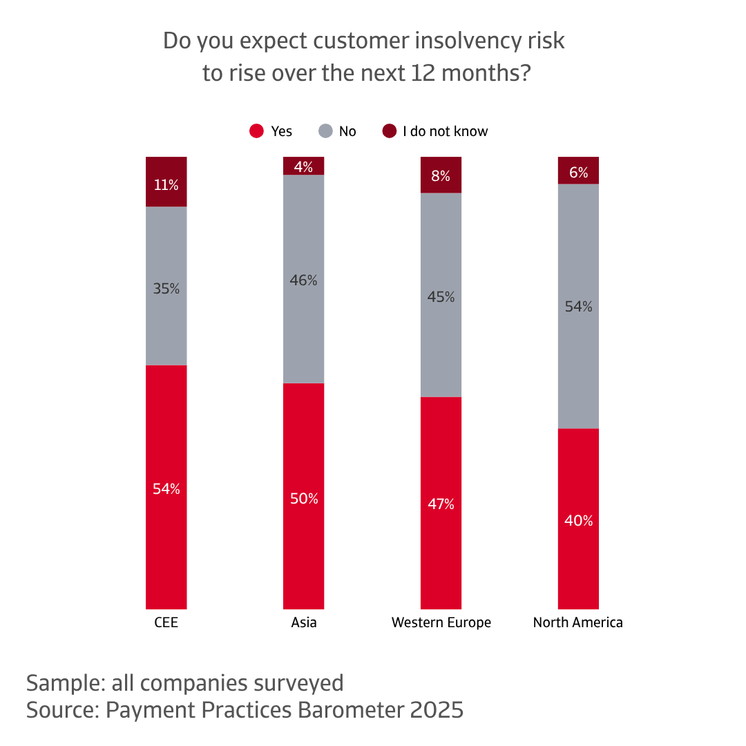 V západní Evropě jsou pak očekávání jsou více rozdělená. Některé firmy věří, že současné podmínky mohou přetrvat, zatímco jiné se připravují na zhoršení, což odráží ekonomickou nejistotu regionu. Ve střední a východní Evropě jsou obavy výraznější. Firmy v regionu jsou obzvlášť ostražité vůči možnému nárůstu insolvencí vzhledem k jejich vystavení globálním překážkám a potřebě robustního řízení rizik.