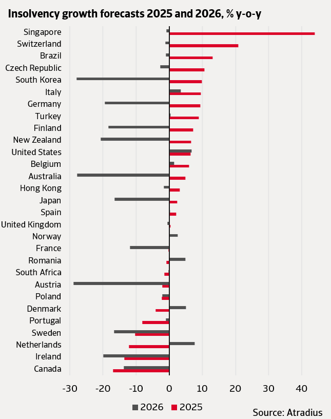 Itálie a Singapur vykazují odlišný obraz, přičemž nárůsty odrážejí spíše stabilizaci z neobvykle nízkých úrovní během pandemie. Trend v Itálii je postupný, směřující k předpandemickým hodnotám, zatímco Singapur zaznamenal prudký skok, který překročil předpandemickou úroveň. V Singapuru kombinace trvale vysokých provozních nákladů, nejisté poptávky zákazníků a napjatého cash flow vytváří náročné podmínky pro podniky.