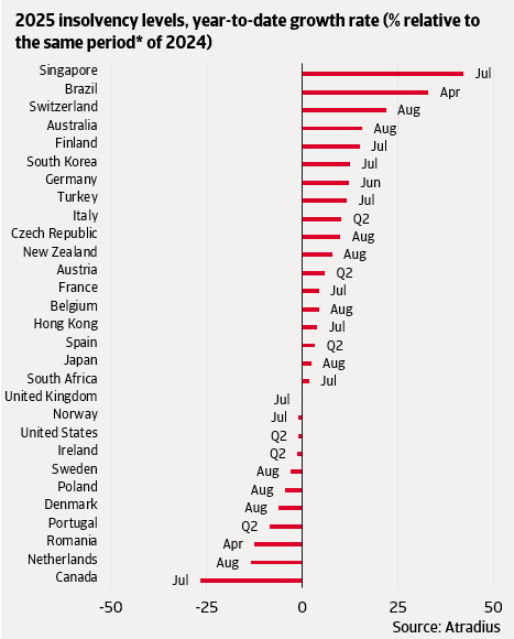 Menšina trhů však vykazuje jen malé změny nebo poklesy, což zdůrazňuje odolnost navzdory globálním obtížím. Ve Spojených státech zůstal počet insolvencí prakticky nezměněn, navzdory tlaku rostoucích cel. Negativní dopad cel byl krátkodobě absorbován firmami, které zvýšily zásoby v očekávání jejich zavedení. Ve Spojeném království zůstaly insolvence také stabilní, ale na úrovních nad předpandemickými, což odráží obtížnější prostředí pro podniky po Brexitu.