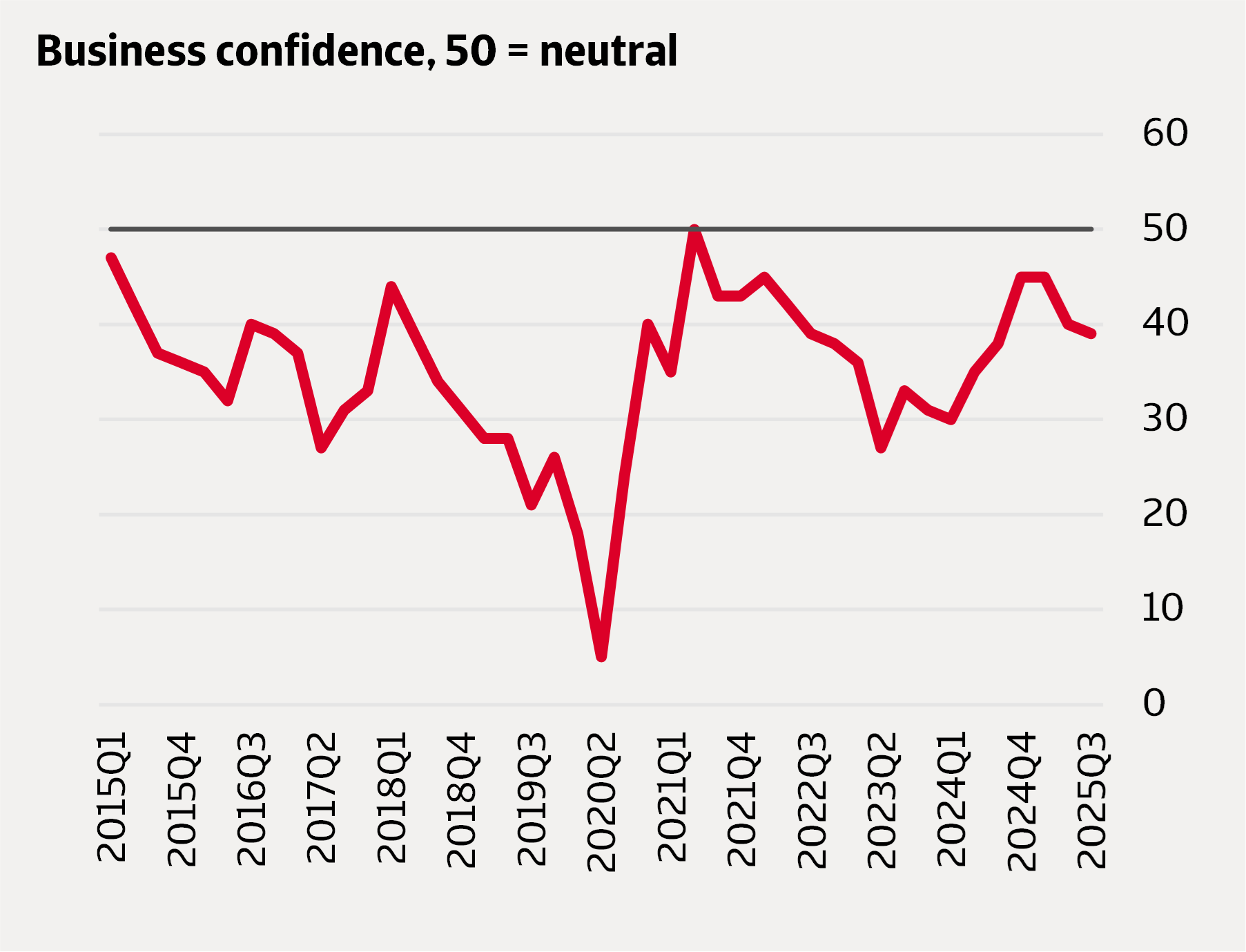 Substantial investment is undeniably required-, but from whom? The government’s fiscal space is limited, making private investment crucial. However, the structural infrastructure constraints of above, rising borrowing costs, political uncertainty and inconsistent policies have discouraged private investors over the past decade. Frequent policy shifts, unclear regulations, and slow implementation have eroded confidence. As seen in figure 5, business confidence has been below 50 for a decade.