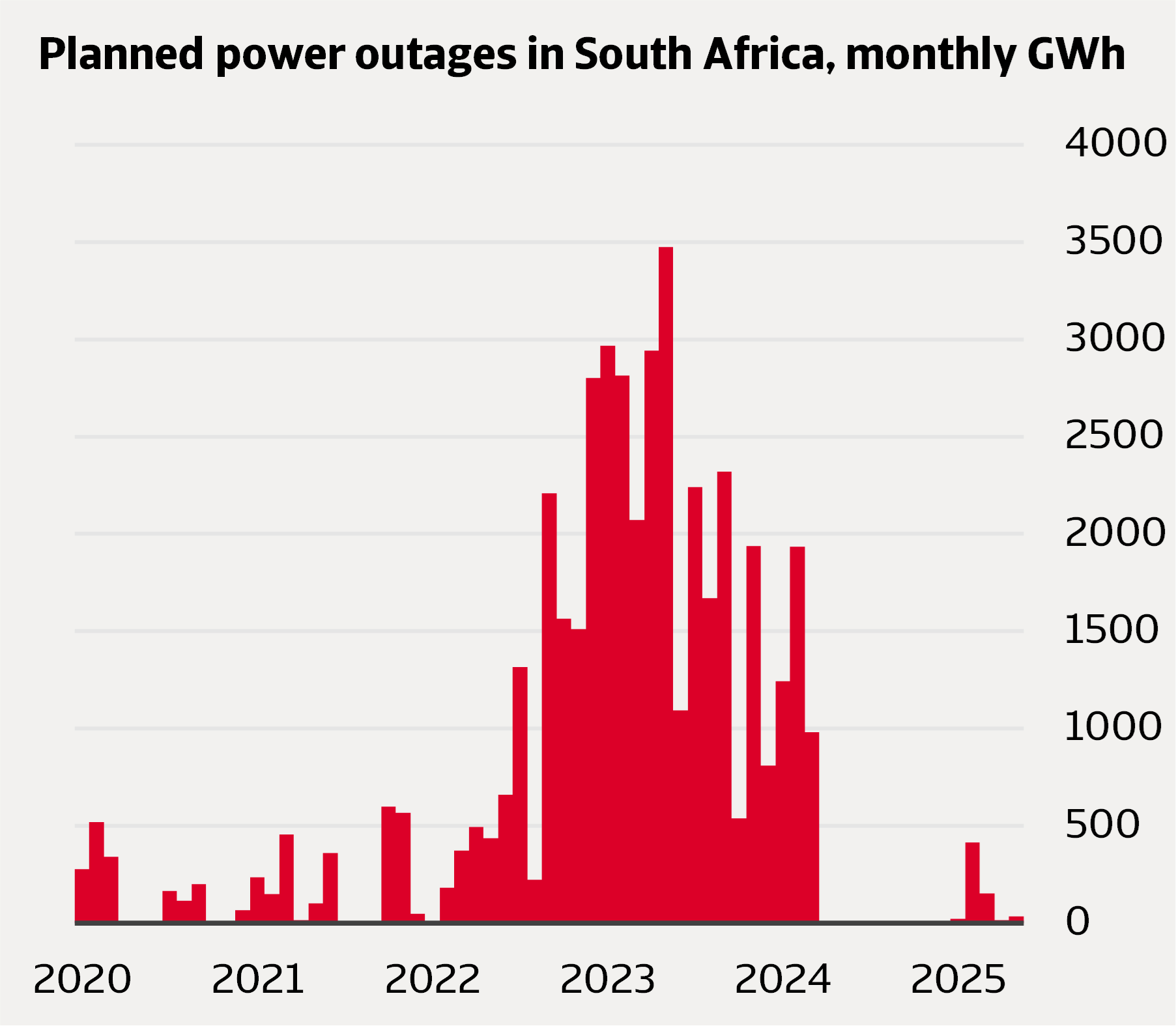 Since March 2024, the frequency of load shedding has dropped. Eskom, a SOE and the main provider of electricity, was able to bring several generation units back online after long-term maintenance. In addition, the private sector invested heavily in alternative energy sources, easing the pressure on the national grid. Despite these improvements, the electricity supply remains fragile. Load shedding returned briefly in early 2025, highlighting ongoing vulnerabilities.