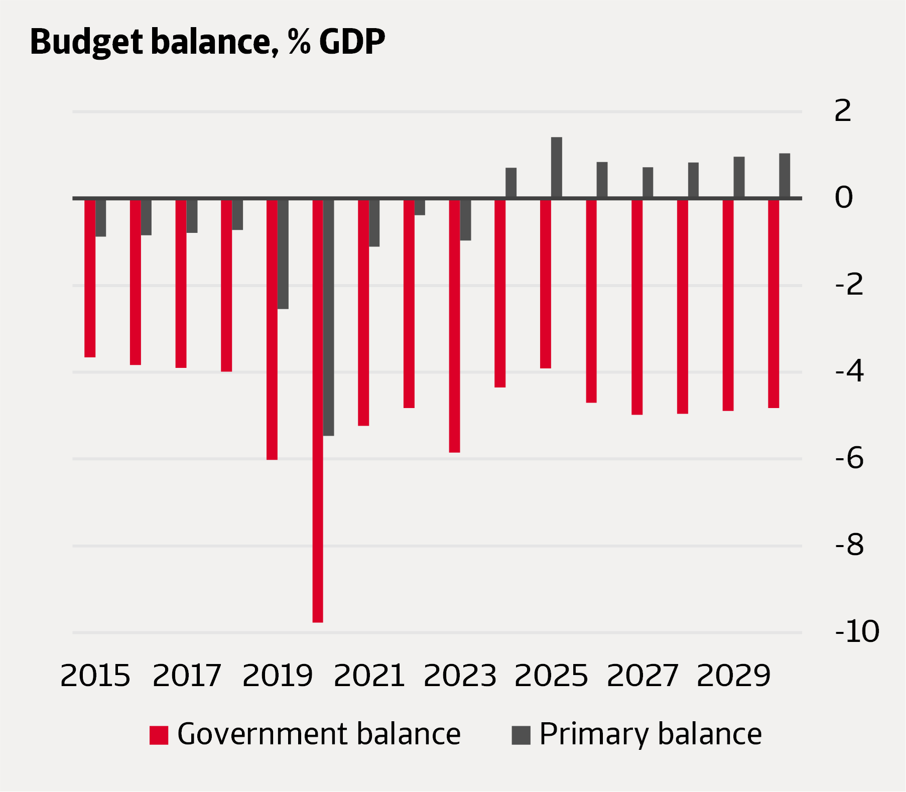 Looking at the persistent tensions within the coalition, it is most likely that the government will muddle through, creating uncertainty and slowly implementing structural reforms. Hereby being cautious to implement the most ambitious reforms, which are highly needed to accelerate growth. Therefore, we expect that economic growth will remain modest in the coming years. In 2026, growth will be slightly higher at 1.1% due to the recent improvements in electricity supply and steps toward private sector involvement in logistics. In addition, growth will be supported by the expected recovery in private consumption due to the pension reform. However, the impact of US tariffs will negatively affect economic activity in the near term. Further improvements in electricity and logistics will contribute to an increase in economic growth towards 2030. Although this increase is limited as growth is expected to move around 1.8% towards 2030.